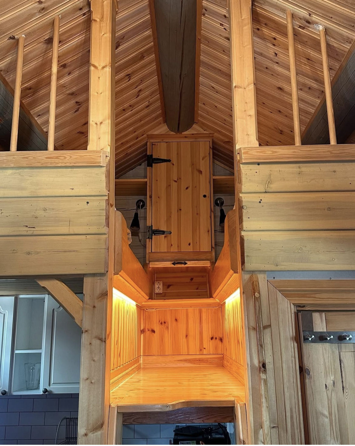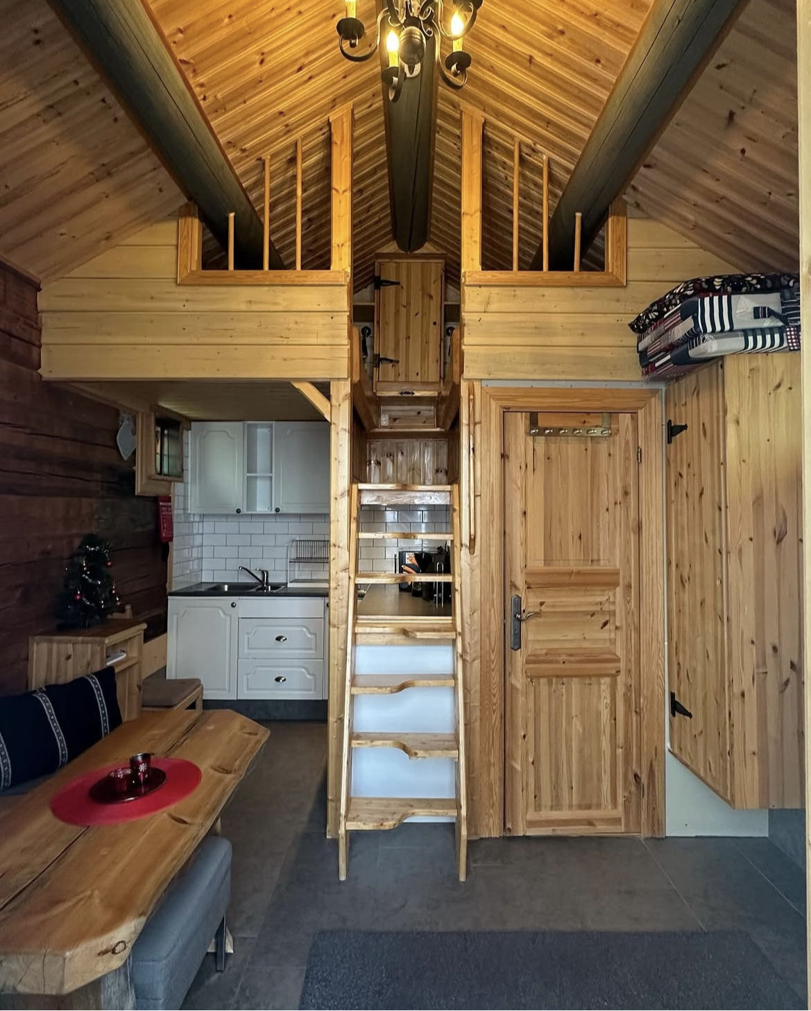 På loftet med ståhöjd i mitten finns 2 st. 140 cm sängar Allrummet är en kombinerad mat och sällskapsplats med en platsbygd soffa med ett bord. TV och DVD finns.